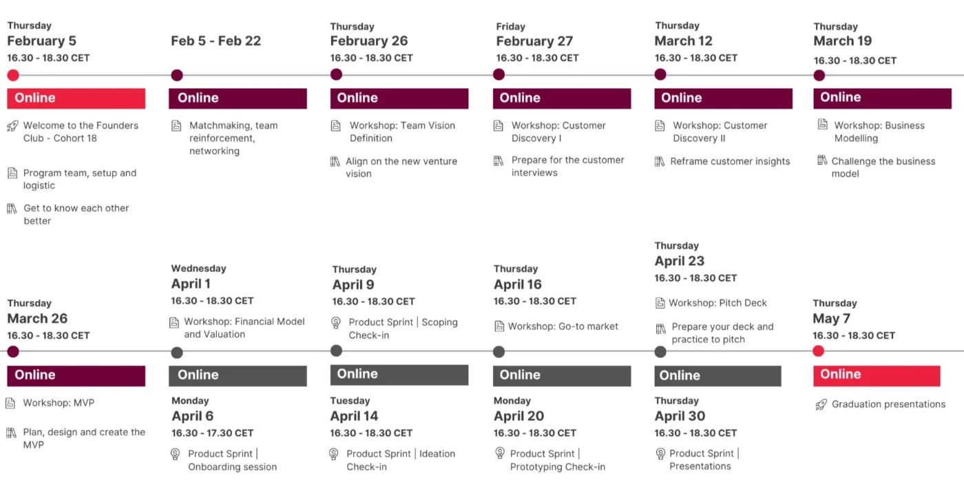 Find a like-minded co-founder or reinforce your existing team. Access a diverse network of entrepreneurs with complementary skill sets. The Founder Clubs allows you to look for the best co-founder in more than one cohort, until you find your ideal match.